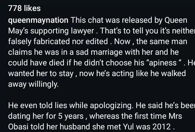 Queen Kelechi asserted, “Later they are going to say MAY didn’t give him peace. It is a case of dishonest gone improper. Ndi peace ambasadors over to una”.